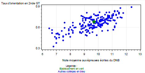 Le collège est encore une fois sur ce graphique proche de valeurs moyennes. En complétant le graphique par une droite de régression, tracée même de manière empirique, je pense que la position du collège est sur la droite. La corrélation entre note moyenne aux épreuves écrites du DNB et taux d’orientation en 2GT est juste, et peut être conforme aux attendus.